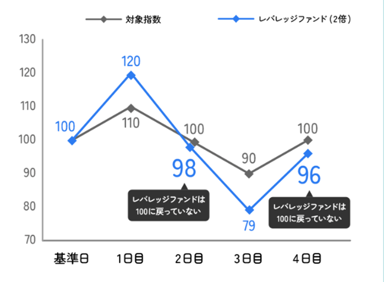 グラフのように、上昇・下落を相互に繰り返し、そして、投資期間が長期になればなるほど、原指標の変動率とレバレッジ型指標の変動率の乖離が大きくなります。